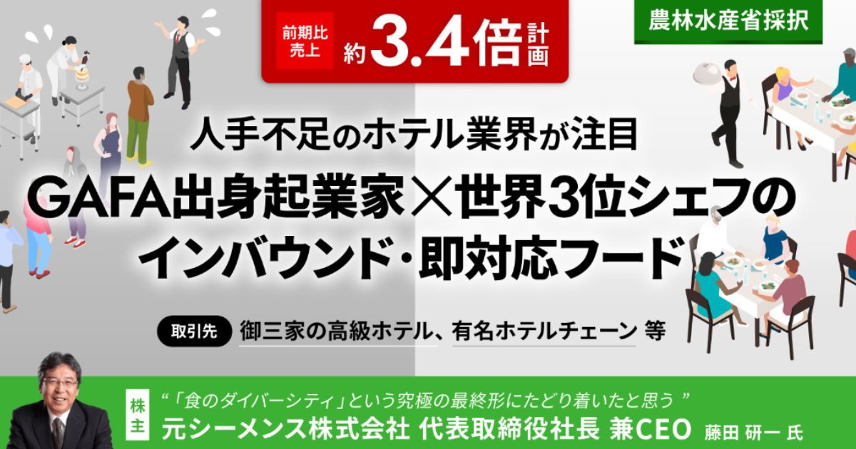 募集タイトル | 〈売上前期比3.4倍超計画〉農林水産省が採択した未来の食。GAFA出身起業家×世界3位のシェフがつくる「ユニバーサル調理済み食品」に人手不足のホテル業界が注目 |