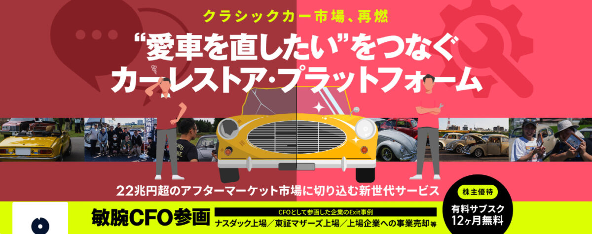| 事業内容 | カーレストア(経年劣化や故障した古い車を走行可能な状態、あるいは新車当時の状態にまで修復・復元すること)に特化した完全招待制のプラットフォームを展開 |